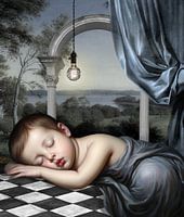 Een digitaal vervaardigd (opgebouwd uit verschillende afbeeldingen uit oude schilderijen) portret van een baby, in een surrealistisch landschap.