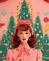 Sweet Christmas. Een "zoete" illustratie in pastelkleuren van een jonge vrouw in het roze gekleed. Achter haar bevinden zich meerdere kerstbomen en kerstdecoraties. Erg leuk als extra decoratie tijdens kerst!
