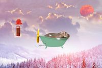 Met de digitale collage ‘Sweet Dreams’ doezel je in no time naar dromenland, suizend door de schitterende avondlucht in een vliegende badkuip met een nijlpaard als gezelschap!