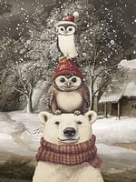Een vrolijke en hartverwarmende winterscène, perfect voor de feestdagen. De illustratie heeft een dromerige, handgetekende uitstraling en vangt de magie van een besneeuwde dag.
