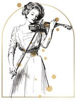 Een jonge vrouw speelt viool, ze is afgebeeld op een witte achtergrond. Ik heb subtiele gouden accenten aan de afbeelding toegevoegd.