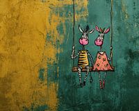 Swinging Partners - Dit is een dieren schilderij van een zebra en een paard die samen op een schommel zitten, met een speelse combinatie van kleuren en een vrolijke uitstraling.