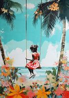 Mixed media afbeelding van een meisje in zwartwit met een rood jurkje en gympen op een schommel aan het strand met palmbomen en kleurrijke bloemen op de voorgrond. Passend bij diverse stijlen en trends. Pop of colour. Zomerse afbeelding. Onschuld, spelen. Bloemenveld. Artist: Bianca ter Riet.