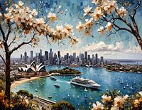 Een levendige afbeelding van een panoramisch uitzicht op de haven van Sydney, met het iconische Sydney Opera House en de Harbour Bridge op de achtergrond. De voorgrond is versierd met bloeiende bomen die een schilderachtig kader bieden voor het bruisende stadslandschap en het rustige water dat bezaaid is met boten.