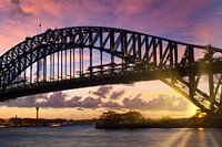 Impressie van de Sydney Harbour Bridge bij zonsondergang. De brug overspant de haven van Dawes Point naar Milsons Point.