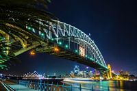 Deze contrastrijke en scherpe foto van de Harbour Bridge is in de nacht gefotografeerd met een lange sluitingstijd, waardoor het water een mooie glooiende en reflecterende effect toont met de meest prachtige kleuren van de stad.