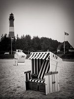 De foto toont het strand van Hörnum met zijn typische strandstoelen en de vuurtoren van Hörnum op de achtergrond.