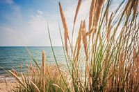 Eine Nordsee-Impression aus Sylt mit Dünengras und Strand.