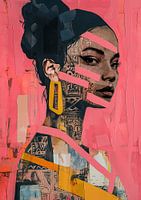 De vrouw heeft zwart haar met een subtiele blauwe gloed, een moderne touch die haar uitstraling eigentijds en dynamisch maakt. De gele oorbellen contrasteren sterk met de roze achtergrond, terwijl roze strepen en abstracte vormen over haar gezicht en kleding zijn verspreid, wat de balans tussen oud en nieuw benadrukt. Dit gemengde media-stuk spreekt tot de kracht van tradities, terwijl het tegelijkertijd een moderne vrouw uitbeeldt die krachtig en onafhankelijk is in een steeds veranderende wereld. Pop Art