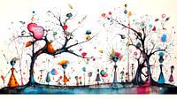 Dit kunstwerk toont een levendige, sprookjesachtige scène waarin abstracte en fantasierijke figuren samenkomen in een wonderlijk bos.