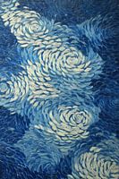 "Symfonie van de Zee" is een expressief, abstract werk dat de golven van de oceaan vangt in een draaikolk van kleur en beweging. Blauwe en witte tinten dansen in cirkelvormige patronen over een donkere achtergrond, met een levendige structuur die doet denken aan het penseelwerk van Vincent van Gogh.