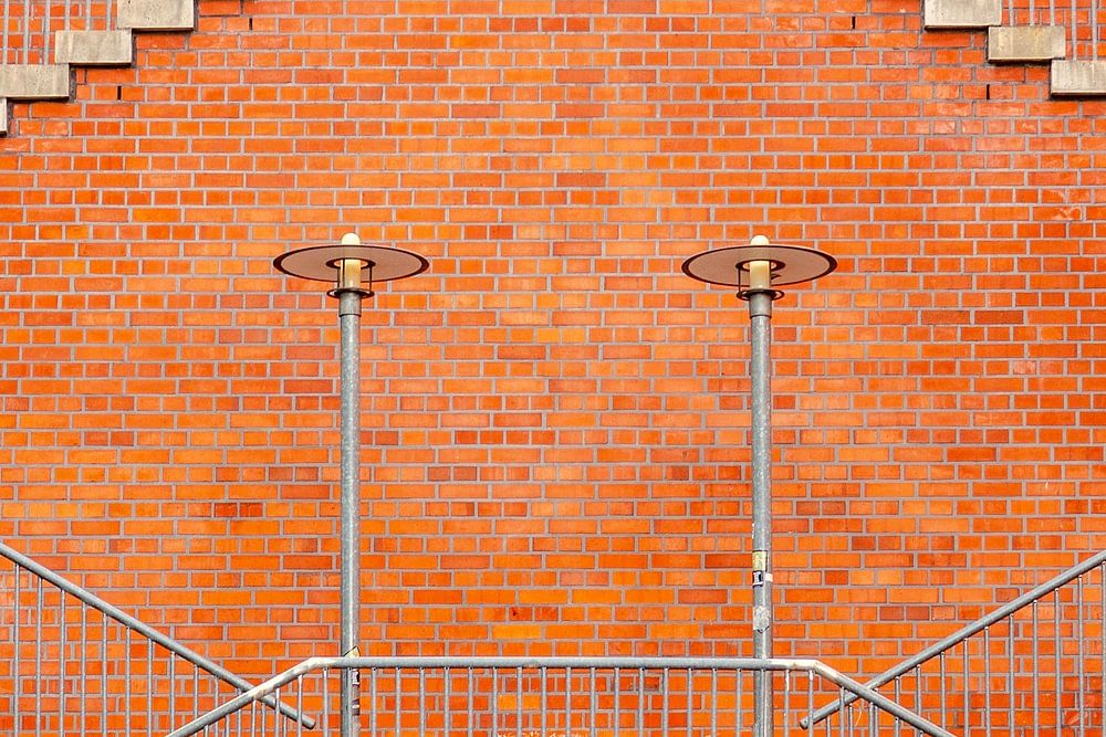 Twee moderne straatlantaarns met ronde lampenkappen staan in het midden van de muur en vullen de compositie aan met verticale elementen. De bakstenen muur vertoont tekenen van slijtage, wat de foto een authentieke, stedelijke sfeer geeft. De combinatie van beton, metaal en bakstenen creëert een industriële esthetiek die zowel modern als tijdloos is.