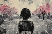 Symmetrie van de Lente vangt een verstild moment waarin natuur en structuur elkaar ontmoeten. In het midden van de compositie staat een solitaire figuur, van achteren gezien, precies op de as van het beeld. De rechte lijnen van het plein vormen een geometrisch raster dat het oog onvermijdelijk naar de horizon leidt. Aan weerszijden…