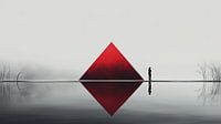 Een eenzame figuur staat naast een perfect gespiegelde rode diamant, een symbool dat zowel kracht als mysterie uitstraalt. Het water om hen heen is zo stil dat het een spiegel lijkt, waarin de contouren van kale bomen en de nevelige achtergrond samensmelten tot een rustgevend tafereel.