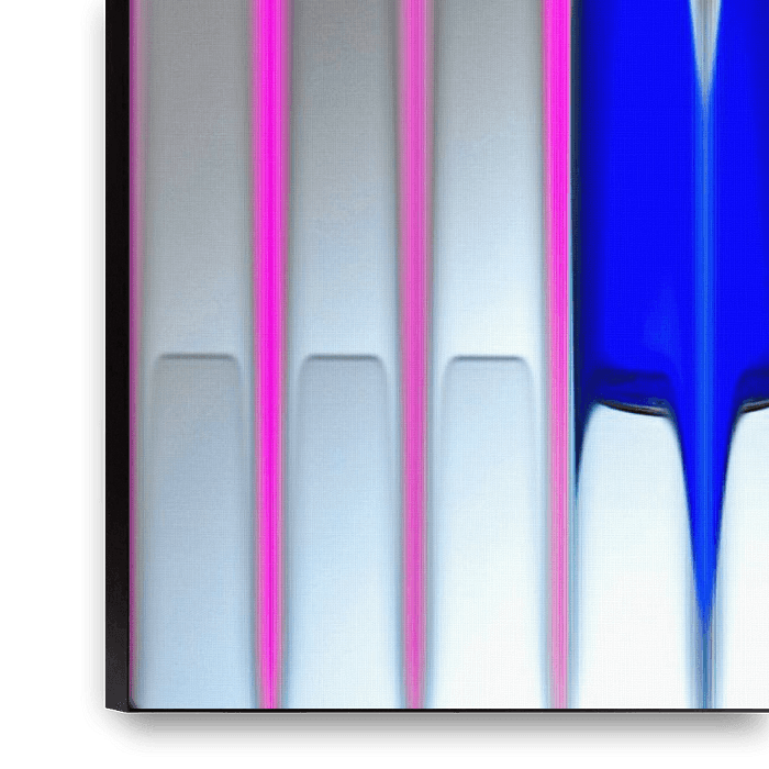 Een abstract kunstwerk met een reeks verticale structuren doordrenkt met intense tinten p!nk en blauw, met in het midden vier symmetrisch geplaatste glazen flessen met een delicate blauwe inhoud. De contrasten van licht en donker geven het werk een driedimensionale diepte, terwijl de heldere lijnen en spiegelachtige symmetrie een…