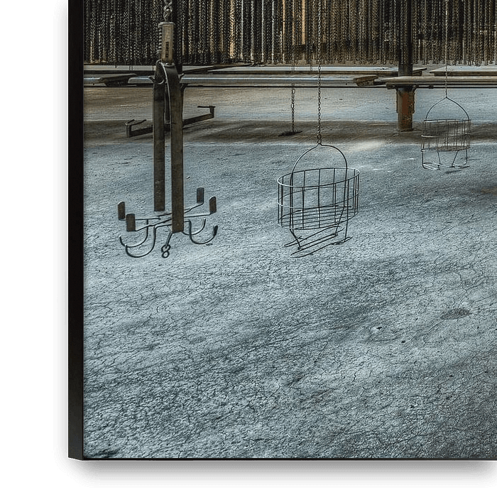 Een hal met mandjes waarin de werknemers hun persoonlijke spullen opbergden voor ze aan het werk gingen in een oude vervallen en verlaten kolenmijn in Duitsland. De foto geeft een beeld van diepte, lichtval en lijnenspel en symmetrie met veel details. Hierdoor blijf je kijken naar alles wat er te zien valt.