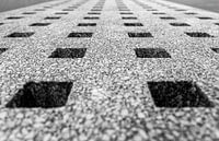 Zwart/wit foto van een detail van moderne zitbanken in Breskens wat vanuit de juiste hoek gefotografeerd een mooi perspectief geeft. Past gaaf in een modern interieur.