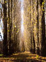 Deze rij bomen staan in het Maximapark in Utrecht. Deze foto is in de herfst genomen, waardoor er schaduwen en zonlicht op de door herfstbladeren bedekte bodem strijken. Door een open diafragma te gebruiken ligt het scherptepunt in de verte en wordt de voorgrond een beetje onscherp. Dit werkt sfeer verhogend.