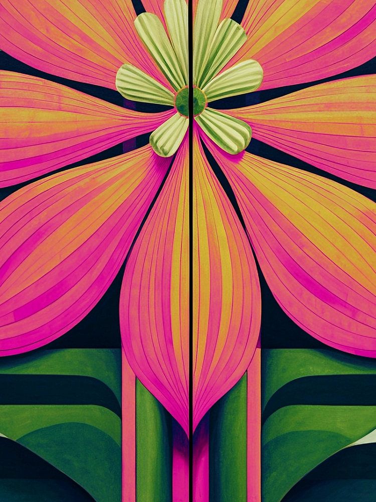Tropische bloem, symmetrisch abstract in de stijl van een vintage poster. Dit werkstuk is gemaakt in samenwerking met kunstmatige intelligentie.