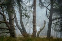 Dit tafereeltje dat op dezelfde dag werd gefotografeerd als verschillende andere foto's in het Pine Forests album deed me denken aan een boeket bloemen door de manier waarop de stammen bijna uit elkaar vielen naar de zijkanten. De sfeer was stemmig door de zeer dichte mist die pas na vele uren optrok en dit was de eerste foto die ik die dag maakte. De kleine gebogen boomstam zonder schors in het midden spreekt mij erg aan die op weg lijkt een vraagteken te vormen. Het weerspiegelt de vormen van de bomen meer naar het midden links van het frame. De mist was zo dicht dat de achtergrond nauwelijks zichtbaar was en het was maar al te gemakkelijk om overweldigd te worden door de schoonheid van dit alles. Ik ontmoette een vrouw en zij zei: is het niet alsof je in Sprookjesland wandelt? En zo was het.