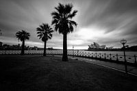 Een foto van een prachtige locatie in Sydney, Australie. Op de achtergrond het opera house en op de voorgrond de palmbomen. Sluier bewolken die de sfeer wat donkerder maken. Foto is gemaakt net na zonsopkomst.