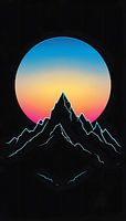 Badend in de neongloed van een retro-futuristische zon doorboort een grillige bergketen de schemerlucht. Elektrisch blauwe contouren tekenen de pieken en dalen af en vormen een opvallend contrast met het kleurverloop van cyaan, oranje en magenta. Dit kunstwerk roept een gevoel op van nostalgisch avontuur en de uitgestrektheid van een digitale grens.