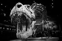 De afbeelding toont een indrukwekkend skelet van een Tyrannosaurus rex, opgesteld in een museum. Het massieve schedelgedeelte, de scherpe tanden en de geopende kaken geven het een dreigend en imposant uiterlijk. De foto is in zwart-wit, wat de dramatiek en het historische karakter versterkt. De belichting zorgt voor diepe schaduwen,…