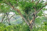 Een moeder met twee welpen rusten in een boom. Deze leeuwen hebben zich aangepast aan hun omgeving door gebruik te maken van de bomen als schuilplaats, maar ook voor de jacht.