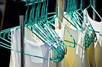 Een kledingrek op straat voor een winkel in een Noord-Spaanse stad. Het zonlicht valt op groene kledinghangers met T-shirts .