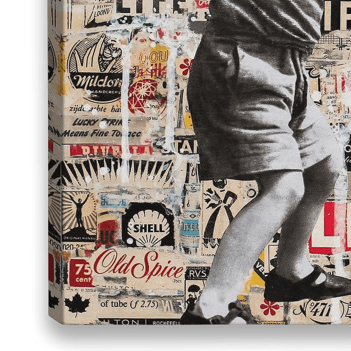 Voor dit kunstwerk heb ik eerst een collage gemaakt van 64 x 46 cm, waarbij ik kleine stukjes reclame advertenties uit tijdschriften van 1960 - 1964 heb gebruikt. Daar overheen heb ik een oude afbeelding van een jongetje gezet. Ik combineer originele foto's, divers papier, acryl verf, houtskool, inkt, balpen en potlood in mijn…