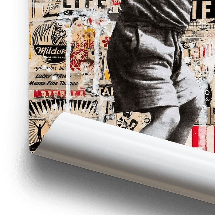 Voor dit kunstwerk heb ik eerst een collage gemaakt van 64 x 46 cm, waarbij ik kleine stukjes reclame advertenties uit tijdschriften van 1960 - 1964 heb gebruikt. Daar overheen heb ik een oude afbeelding van een jongetje gezet. Ik combineer originele foto's, divers papier, acryl verf, houtskool, inkt, balpen en potlood in mijn…