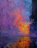 Dompel jezelf onder in de levendige energie van dit abstracte zonsonderganglandschap, waar felle kleuren en expressieve textuur samenkomen om een werkelijk betoverend statement piece te creëren. Dit kunstwerk, gemaakt met een meesterlijke paletmestechniek, bevat dynamische lagen paars, oranje en blauw, die de vluchtige schoonheid van de schemering oproepen, weerspiegeld in kalm water.