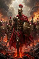 Uit vuur en rook verschijnt de Legioen – krijgers in gouden harnassen, hun rode mantels wapperend als banieren van macht. Geleid door de onwankelbare aanvoerder marcheren zij over de brandende grond, schilden geheven, zwaarden gereed. Achter hen strekt zich de eindeloze formatie van soldaten uit, een levende muur van discipline en kracht.