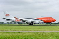 Een Boeing 747-400F van TNT Airways is geland op de Polderbaan en gaat voor onderhoud richting Schiphol-Oost.