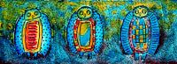 Stukje uit een grotere collage uilen. Heel kleurrijk geschilderd met aquarel op papier en bewerkt met acryl stempeldruk. Getekend met oostindische inkt. Het maakt deel uit van een grote serie dieren tekeningen en aquarellen, gebaseerd op tekeningen van mijn kinderen. In veelvoud geprint voor een zeefdrukserie. Heel mooi en decoratief om meerdere werkjes samen te combineren. Geschikt voor de kinderkamer maar ook voor huiskamer, kantoorruimte of praktijkruimte.