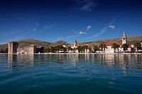 Foto aan de Adriatische kust met uitzicht op Trogir (Dalmatië), Kroatië. Het uitzicht gaat over het Trogirski kanaal naar de promenade en de oude stad van Trogir.
