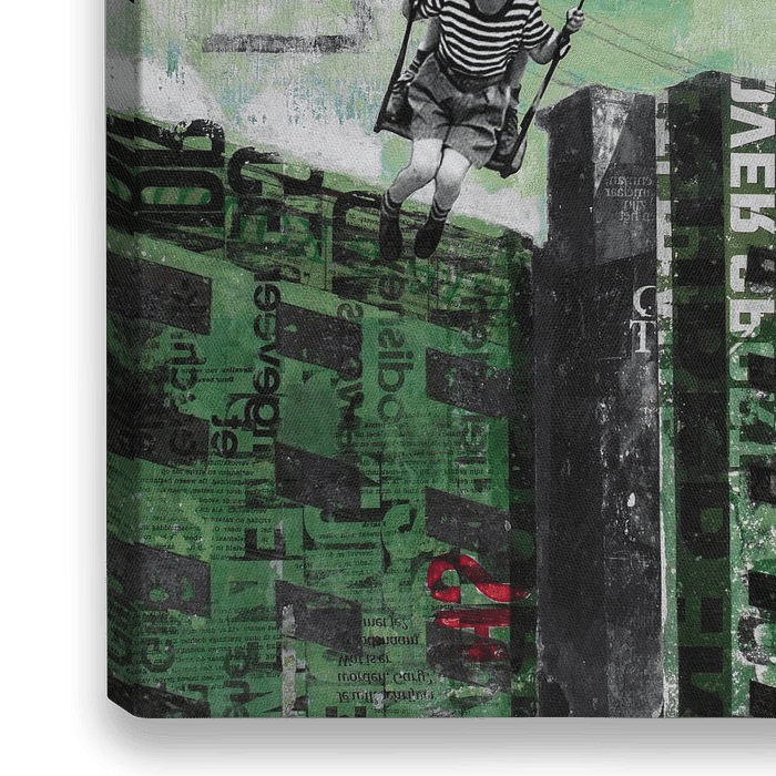 Twee jongens hebben plezier met een schommel. Het is dinsdag. De groene kleur is onderdeel van het gevoel van frisheid op een dinsdag, aan het begin van een nieuwe week. "Al mijn werken zijn geïnspireerd door gepatineerde muren met posters, afbladderende verf en allerlei vervallen dingen. Ik probeer iets nieuws, moois te maken met deze…