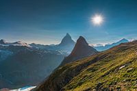 De prachtige Matterhorn en Riffelhorn bij Zermatt in tegenlicht. Vanuit deze hoek lijken beide bergen wel een tweeling.