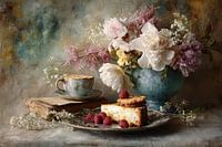 Verfijnd stilleven met een bord met een stuk taart, verse frambozen, knapperige koekjes en een klassiek boek met een kopje koffie of thee erbovenop. Een elegante vaas met een rijk boeket bloemen, waaronder weelderige pioenrozen, straalt luxe en romantiek uit.