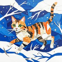 Een speelse kat is afgebeeld met gedurfde geometrische vormen en krantenknipsels. De helderblauwe achtergrond versterkt de levendige sfeer.