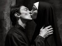 Deze artistieke zwart-witfoto vangt een verboden moment vol emotie en spanning: een geheime kus tussen een non en de pastoor. De compositie is intiem en krachtig, met beide figuren dicht bij elkaar, omringd door subtiele licht- en schaduwcontrasten. De foto heeft een rauwe, eerlijke kwaliteit die de spanning van het moment versterkt. De…