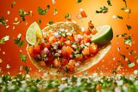 Een heerlijk kunstwerk ontvouwt zich te midden van een bruisende explosie van verse ingrediënten: een knapperige taco gevuld met kleurrijke, sappige tomaten en verfrissende koriander, omlijst door pittig limoensap. Deze levendige compositie is een echte blikvanger in de keuken en brengt de smaak van Mexico bij je thuis!