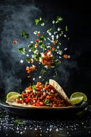 Te midden van drijvende kruiden en verse ingrediënten ontvouwt zich een levendige symfonie van smaken. De kruidigheid en kleuren van het gerecht trekken ieders aandacht en beloven culinaire avonturen. Dit kunstwerk is perfect voor in de keuken en vult de ruimte met een uitnodigende en smaakvolle sfeer.