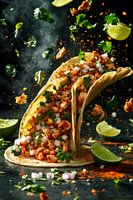 Een feest van smaken in een dynamisch moment: sappige taco's gevuld met verse koriander, uien en pittig limoensap dansen in de lucht. De levendige kleuren en het spannende samenspel van kruiden geven deze compositie een levendige energie. Perfect voor een keuken die de liefde voor koken en lekker eten viert!