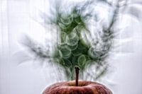 Foto gemaakt met de vintage Meyer-Optik Görlitz Trioplan 50mm f/2.9 rode V (M42). De appel geplaatst voor een vingerplant in het vensterraam waardoor veel licht door de plant valt. het licht in combinatie met de "impe...