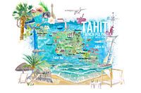 Tahiti geïllustreerde reiskaart met wegen en hoogtepunten