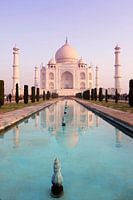 De Taj Mahal in Agra, India met reflectie in de vijver tijdens zonsopkomst.