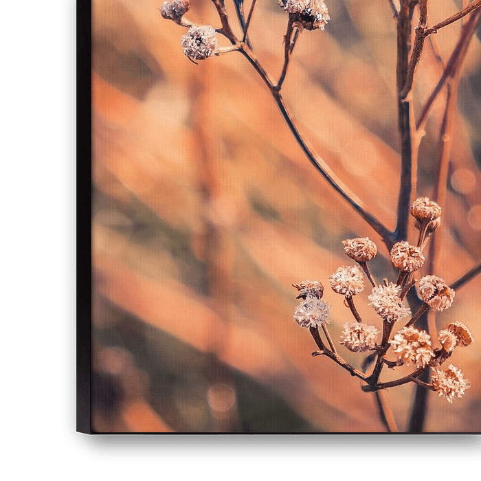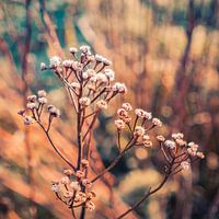 Tak droge bloemen in mooie warme tinten blauwgroen, bruin en oranje. Close-up van een tak met droge bloemen in de winter.