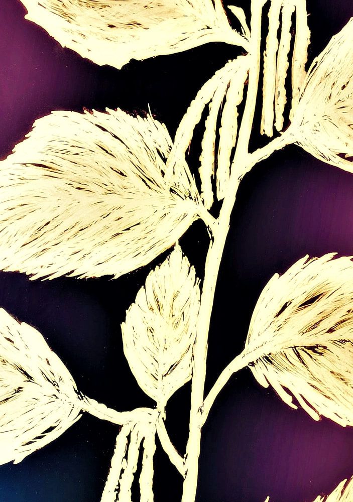 Katjes / Takken / Pentekening / Zwart papier / Bladnerven / Bladeren / Vormen / Bladvormen / Potloodstreepjes / Accenturen / Verschillende vormen / Schaduwen / Diepte/ Goud / Geel /Paars / Digitaal bewerkt/