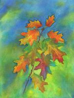 Tak met kleurrijke eikenbladeren is een aquarel schilderij in portret formaat met de hand geschilderd door de kunstenaar Karen Kaspar.